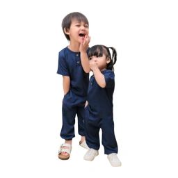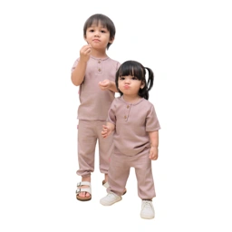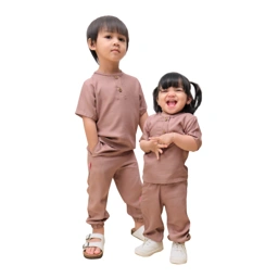 One set abstrak dengan kancing di bagian dada yang memudahkan ketika dipakai anak.