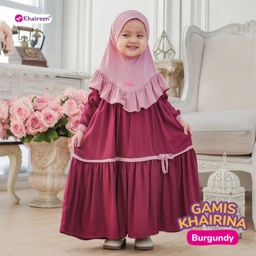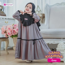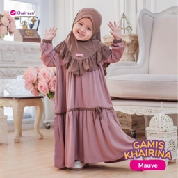 Gamis Khairina, gamis anak perempuan yang mengusung desain anggun, nyaman, dan tetap syar'i. Didesain khusus untuk si kecil tampil cantik dan ceria!
